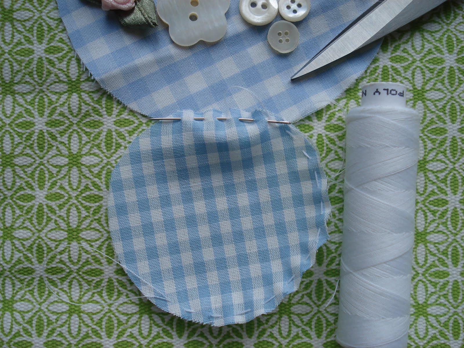 Stoffkreis(e) ausschneiden und Faden genügend lang abschneiden, damit man ihn doppelt nehmen kann.