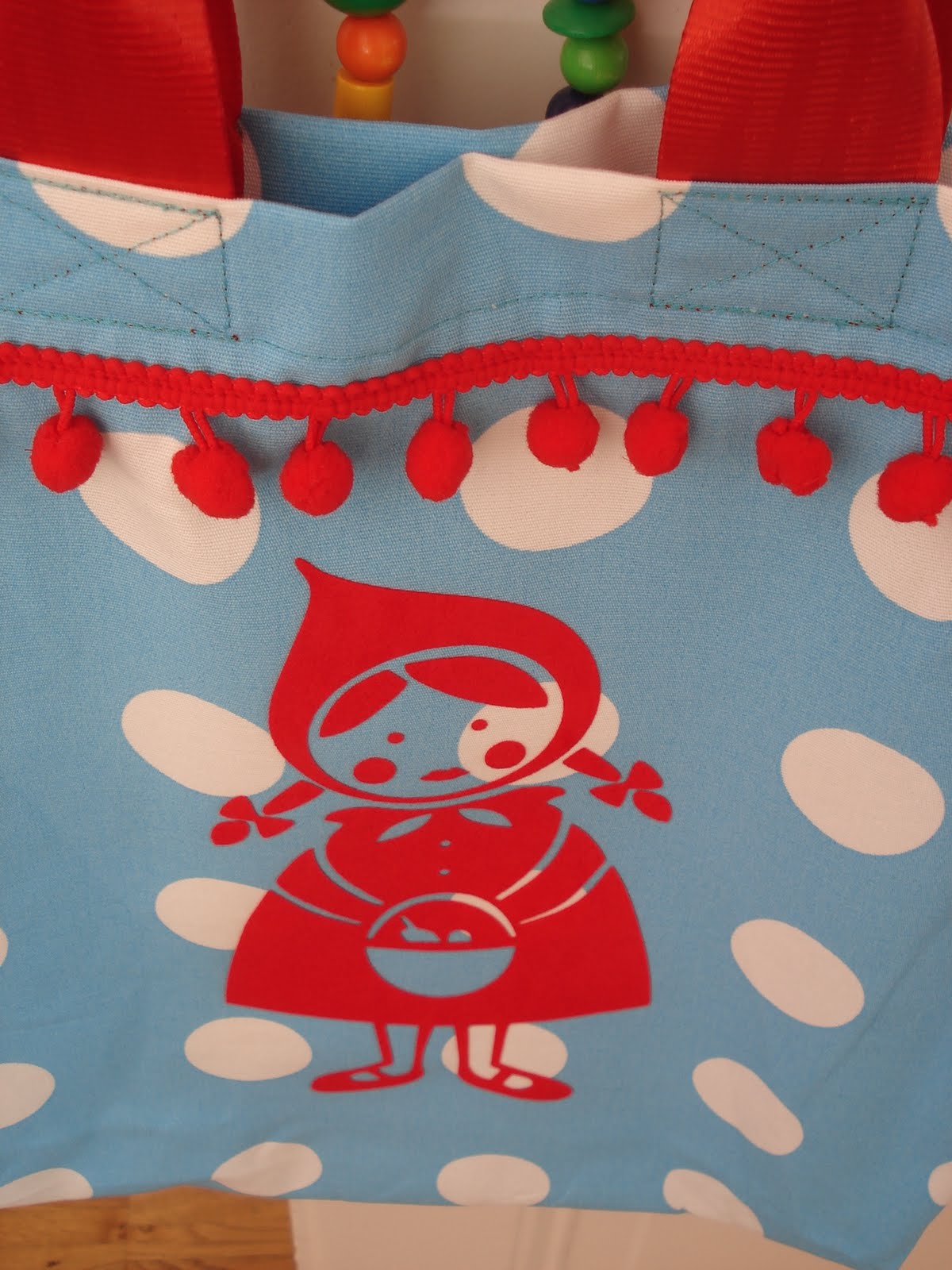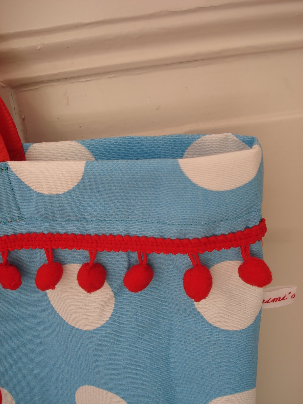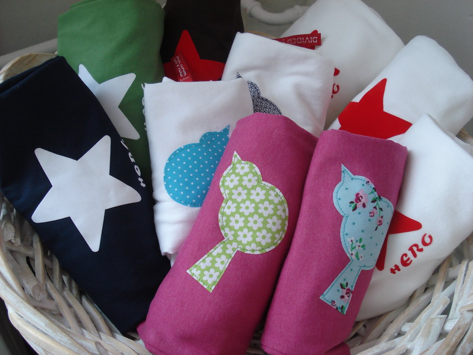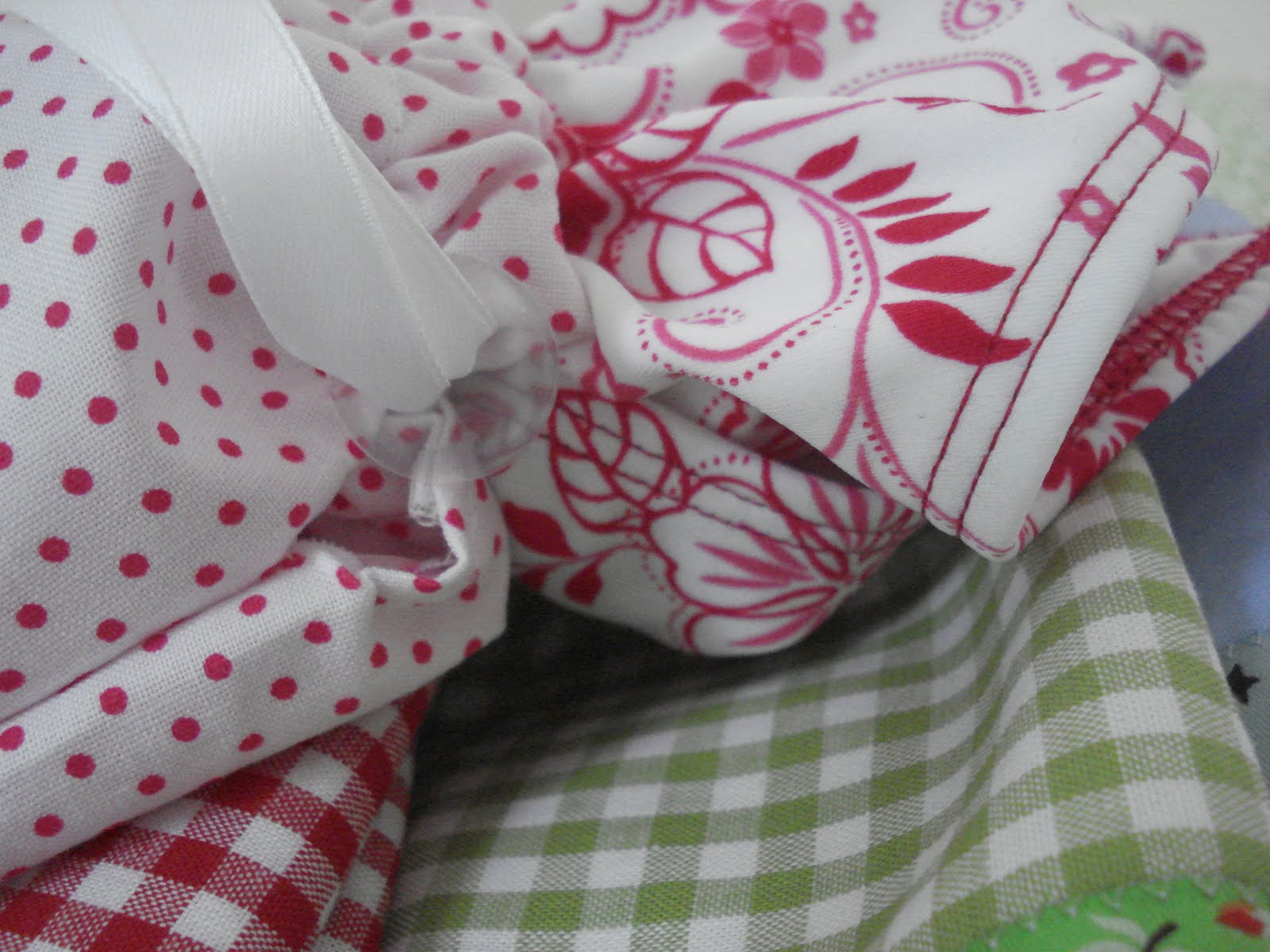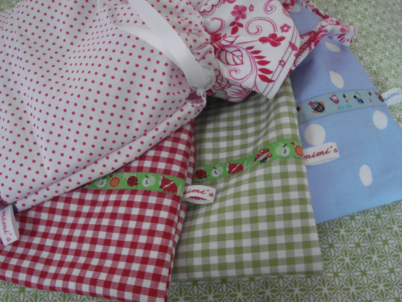 Aussen sind sie aus gewöhnlichem Baumwollstoff genäht und mit einem Webband verziert. Innen hat es ein wasserdichtes Futter. Geschlossen werden sie mit einem Bändel und einem Knopf zum Zuziehen à la mimi.