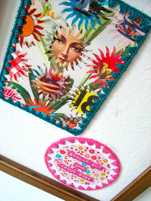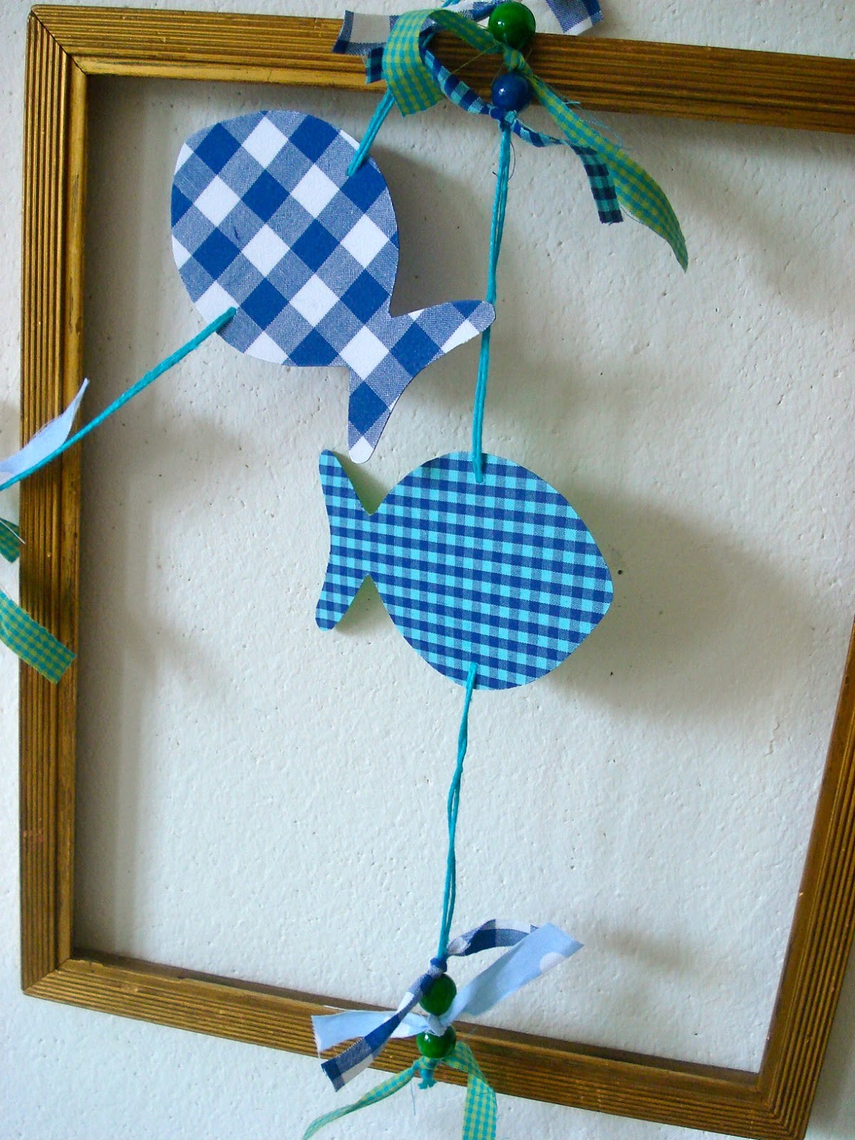 Da schwimmen gleich ein paar Fische durch die Goldrahmen im neuen "Arbeits-Zimmer" und zwischen ihnen sind einige Holzperlen aufgefädelt und Stoffresten zu einfachen Schleifen gebunden.