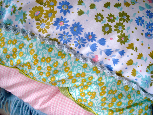 Schon bald können wir am Morgen wieder etwas länger liegen bleiben, den Kopf auf dem Kissen noch einmal drehen und noch etwas träumen ..... und das werde ich auf einem "Blumenwiese-Kissen" machen, das auf den beiden Seiten eine gehäkelte Borte und ein gestempeltes "Glory Morning" bekam.