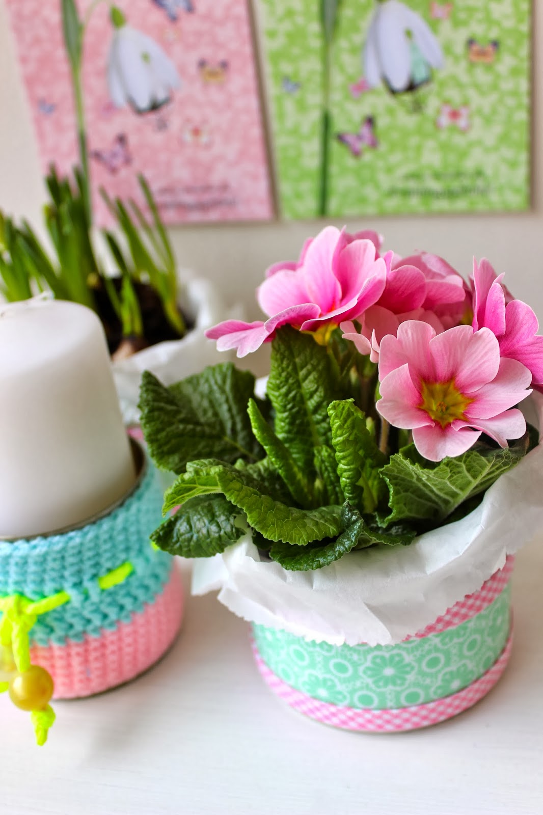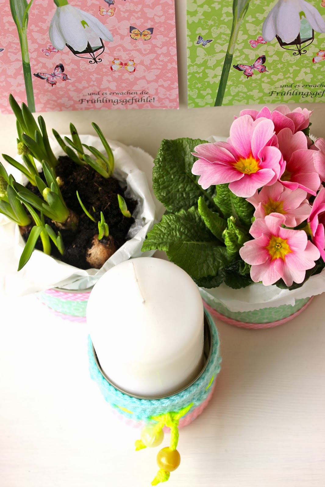 Da habe ich mir ein wenig Frühling zum Aufhängen gekauft .... kleine Blümchen in grün & blau, die nun mit einem Häkelherz bei unserem Esstisch hängen.