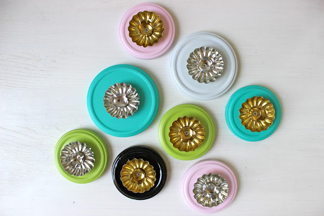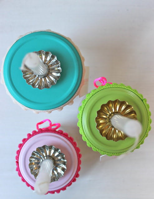 Schon vor einem ganzen Weilchen habe ich Deckel von verschiedenen Schraubgläsern bunt gespritzt (immer noch nicht meine Lieblingsarbeit) oder in ihrer Farbe s/w belassen und Kerzenhalter wie hier drauf geschraubt. Aber keine Angst, das sind keine Vorboten für Weihnachten sondern kleine Geburi-Grüsse.
