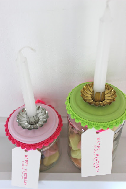 Denn irgendwann fand ich, dass sich die Weihnachtsbaum-Kerzenständerli-Gläser doch auch ganz gut für ein Geburi-Mitbringsel machen würde. Das Glas wird dann statt mit Kerzen mit einem süssen Gruss, einem Gutschein, lieben Wünschen auf Papierröllchen, dem eigentlichen Geburi-Geschenk oderoder .... gefüllt.
