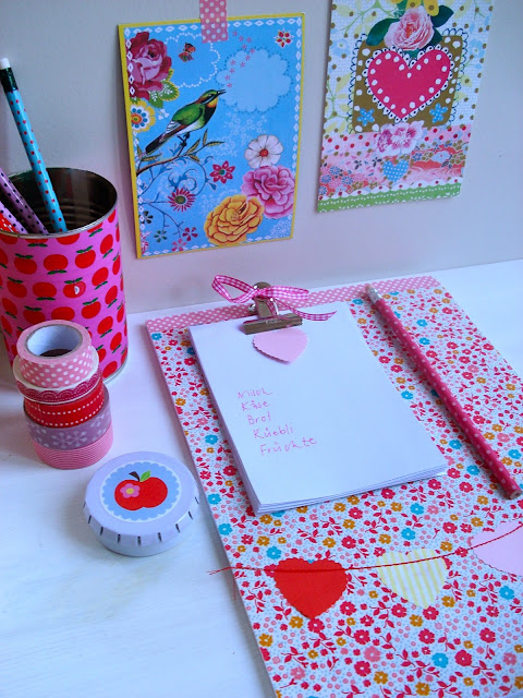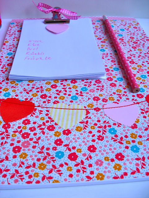 Da der momentane Schreibblock ein nicht sonderlich hübsches Aussehen hatte, habe ich ihn heute beklebt und ein kleines bisschen "vernäht". So kann er auf dem "Arbeits-Zuschneide-Ess-Tisch" liegen bleiben, auch wenn nicht mehr gearbeitet wird.